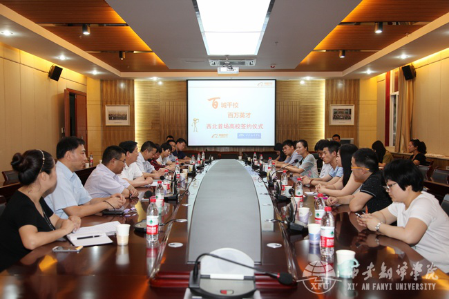 西安翻译学院副院长齐玉水教授、工程技术学院院长谢膺白教授、教务处副处长李彦、电子工程系主任支侃买教授等我校领导出席签约仪式。阿里巴巴西北区总经理黄松先生、市场经理黄静女士、阿里巴巴西北区第三方合作企业西安盛园电子商务公司董事长李彦文先生、外贸经理张莉女士、外贸主管李杨先生及多家省级媒体共同见证了阿里巴巴西北地区首场“跨境电子商务”人才培养签约仪式的盛大召开。